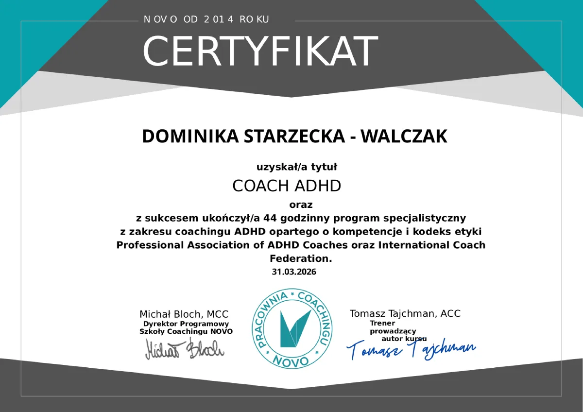 Należę do międzynarodowego grona coachów Neurolanguage Coaching® certyfikowanego przez Efficient Language Coaching Ltd. oraz akredytowanego przez International Coach Federation, ponadto jestem certyfikowanym coachem ADHD.